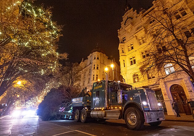 Na Staroměstské náměstí v Praze dorazil v noci vánoční strom. (26. listopadu 2024)