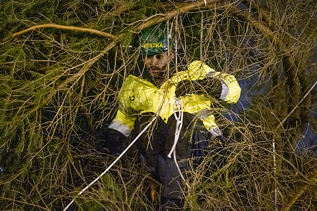 Na Staroměstské náměstí v Praze dorazil v noci vánoční strom. (26. listopadu 2024)