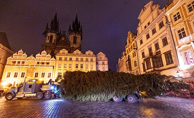 Na Staroměstské náměstí v Praze dorazil v noci vánoční strom. (26. listopadu 2024)