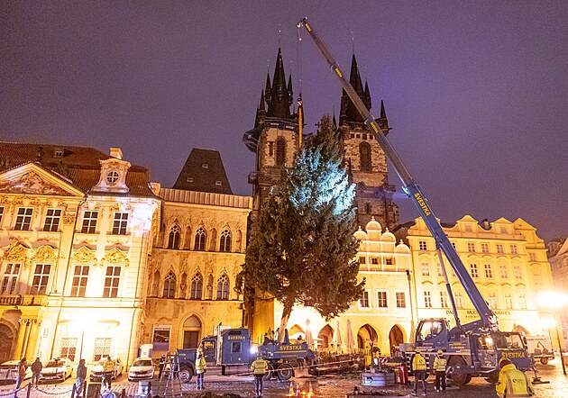 Na Staroměstské náměstí v Praze dorazil v noci vánoční strom. (26. listopadu 2024)