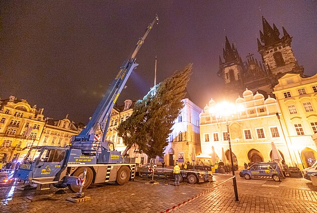 Na Staroměstské náměstí v Praze dorazil v noci vánoční strom. (26. listopadu 2024)