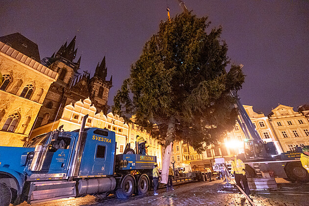Na Staroměstské náměstí v Praze dorazil v noci vánoční strom. (26. listopadu 2024)