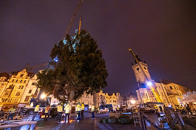 Na Staroměstské náměstí v Praze dorazil v noci vánoční strom. (26. listopadu 2024)