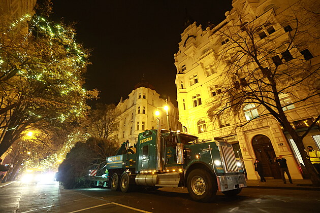 Na Staroměstské náměstí v Praze dorazil v noci vánoční strom. (26. listopadu 2024)