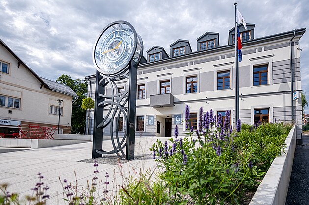 Posezení zdobí také velké designové hodiny ze skla.