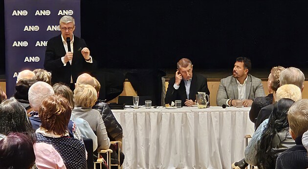 Společně s Andrejem Babišem vystoupili v Opavě také bývalý místopředseda vlády Karel Havlíček (vlevo) a opavský primátor Tomáš Navrátil (18. února 2025)