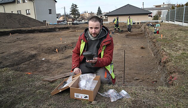 Archeolog Slezského zemského muzea Ondřej Klápa ukazuje artefakty nalezené při pracích na pozemku v Opavě - Kateřinkách. (3. března 2025)