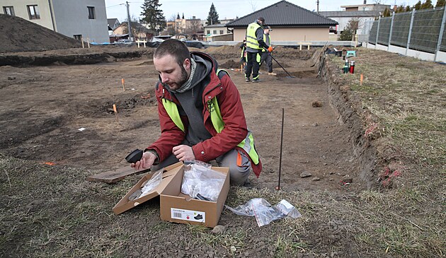 Archeolog Slezského zemského muzea Ondřej Klápa ukazuje artefakty nalezené při pracích na pozemku v Opavě - Kateřinkách. (3. března 2025). (3. března 2025)