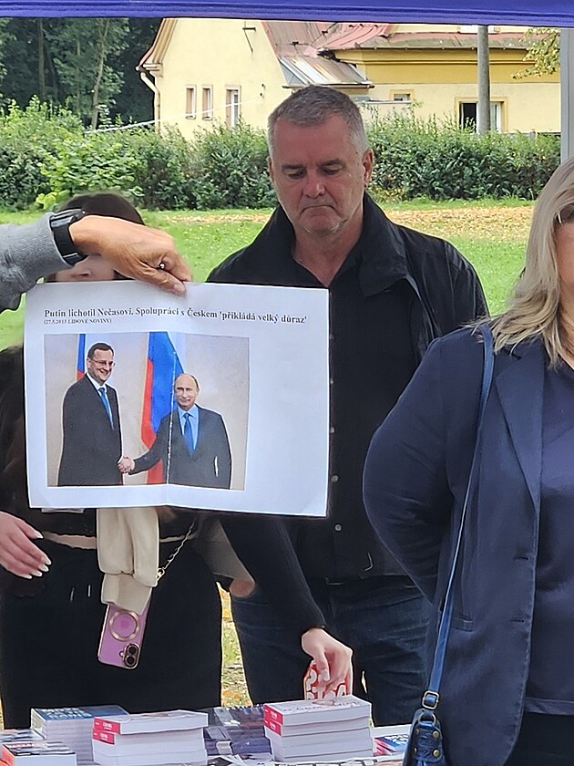 Andrej Babiš ukazuje na svém mítinku na Karvinsku fotografii z roku 2013, na které jsou tehdejší premiér Petr Nečas (ODS) s ruským vůdcem Vladimírem Putinem. (6. září 2025)