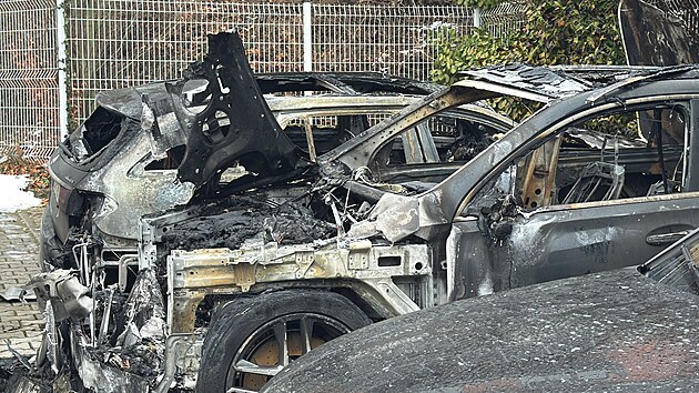 V ulici Filmařská v pražské části Hlubočepy shořela na parkovišti u bytových domů dvě auta. Třetí je poškozené (14. ledna 2025)