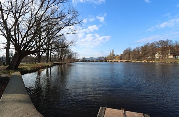Rybník v Ostravě - Porubě kde byla nalezena mrtvola křížence československého vlčáka. (17. února 2025)