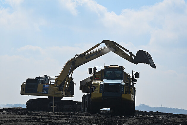 Těžká technika na prohořívající haldě v ostravské části Heřmanice (25. března 2025)
