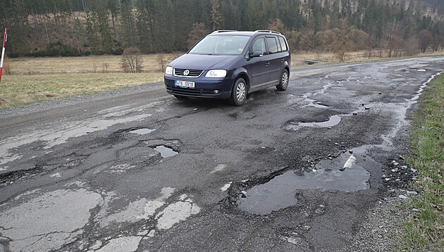 Takto rozbitá je po letošní zimě silnice z Holčovic na Karlovice na Bruntálsku.