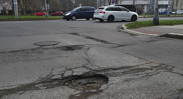 Takové díry na silnici jsou v Ostravě na křižovatce Ostrčilovy ulice se Sokolskou třídou.