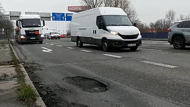 Velkým výtlukům se musejí vyhýbat i řidiči na frekventované ostravské Rudné