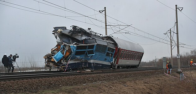 Hasiči odklízejí hrozivé následky železničního neštěstí u Karviné, stav lokomotivy dokládá ničivé účinky nárazu do valníku s vrtnou soupravou. (24. ledna 2024)