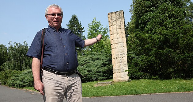Historik Jaromír Polášek u menhiru od sochaře Viléma Kocycha z roku 1998, který byl vztyčen na místě bývalého hřbitova ve Frýdku-Místku. Tam byli pohřbeni zabití Němci po konci 2. světové války. (10. června 2025)