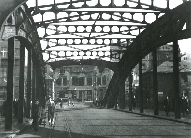 Sýkorův (Říšský) most po osvobození Ostravy. Na konci stojí dům, ze kterého vyletěly hlavice pancéřových pěstí. Na poslední příčné spojce oblouků je vidět poškození od výstřelu z tanku Bedřicha Opočenského.