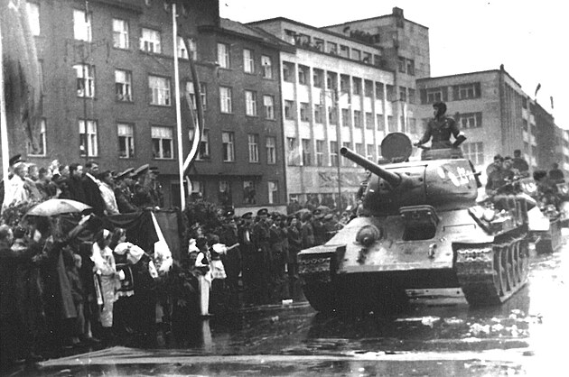 Tanky T-34 na Prokešově náměstí po osvobození Ostravy před osmdesáti lety