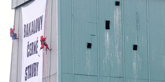 Aktivisté z Greenpeace vyvěšují na frenštátskou těžní věž transparent s nápisem Bakalovy černé stavby. (29. května 2012)