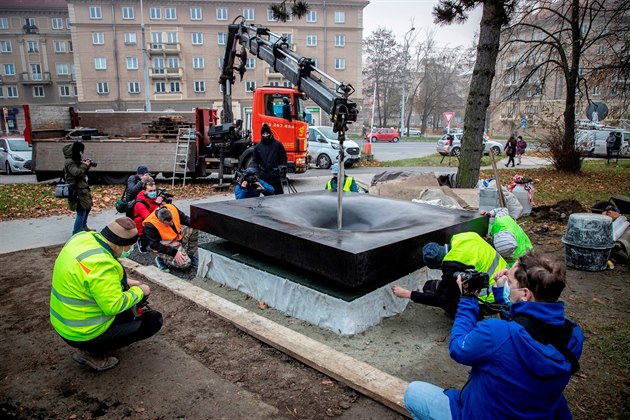 Instalace památníku sedmi obětí střelby v ostravské fakultní nemocnici. Pietní místo bude odhaleno 10. prosince, tedy rok od tragédie. (24. listopadu 2020)