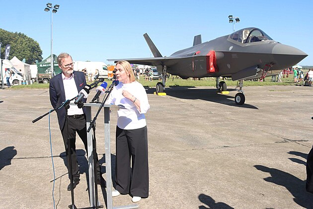 Premiér Petr Fiala na tiskové konferenci na Dnech NATO, kterou pořádal společně s ministryní obrany Janou Černochovou (20. září 2025)