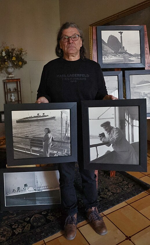 Kastelán zámku v Hradci nad Moravicí Radomír Přibyla s některými z vystavených fotografií. Ukazují například cestu Etelky a Viléma Lichnovských přes oceán.