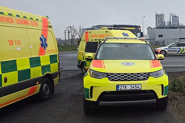 Záchranáři na místě zásahu u tří mužů přiotrávených drogou ve Frýdku-Místku (27. května 2025)