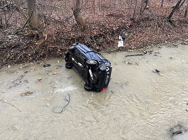 Vůz Škoda částečně převrácený v říčce Ondřejnici mezi obcemi Hukvaldy a Kozlovice na Frýdecko-Místecku. (14. března 2024)