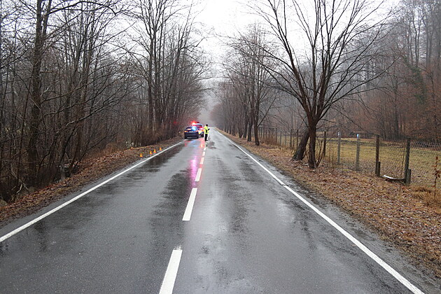 Místo nehody na silnici spojující obce Hukvaldy a Kozlovice na Frýdecko-Místecku (14. března 2024)