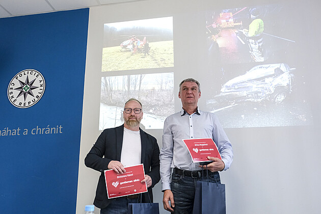 Gentlemani silnic Jiří Magdoň (vpravo) a Břetislav Vala zachránili devatenáctiletou dívku z auta zříceného do řeky Ondřejnice na Frýdecko-Místecku. (14. května 2025)