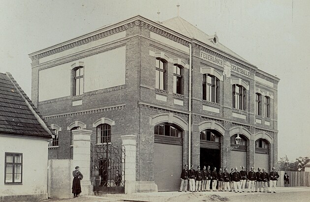 Historická fotografie původní hasičárny na Zborovské ulici v centru Nového Jičína (13. října 2023)