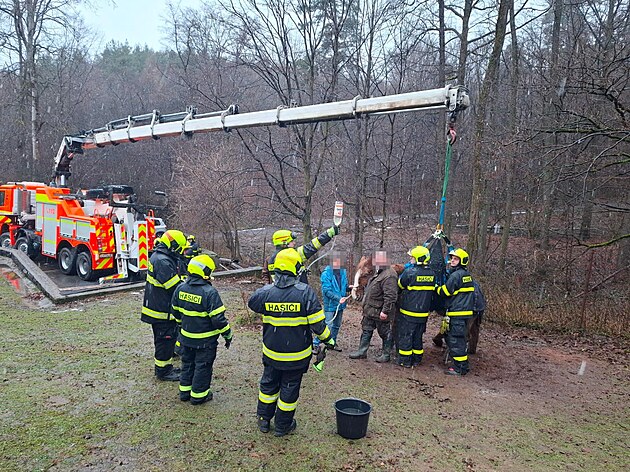 Kobyla spadla ve Velké Polomi na zamrzlém svahu, na nohy jí pomohli hasiči se speciální sítí. (8. ledna 2025)