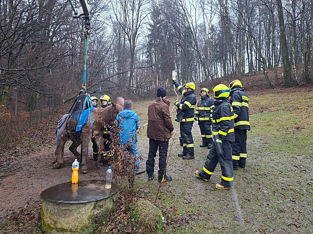 Kobyla spadla ve Velké Polomi na zamrzlém svahu, na nohy jí pomohli hasiči se speciální sítí. (8. ledna 2025)