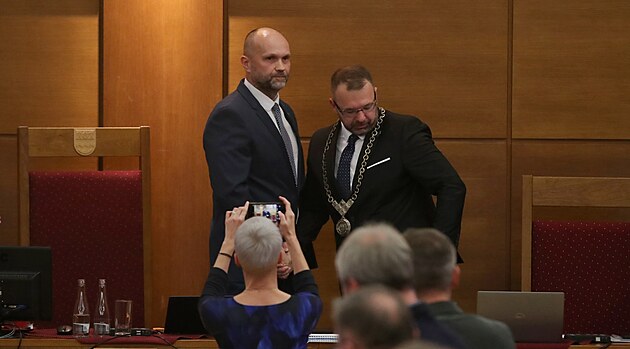 Hejtman a poslanec Josef Bělica (na snímku vlevo) předal funkci havířovského primátora svému stranickému kolegovi Ondřeji Baránkovi (ANO). (9. listopadu 2024)