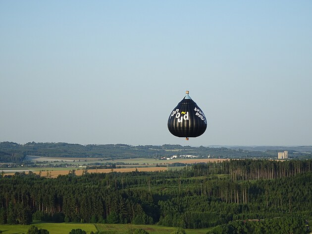 Horkovzdušný balón speciálního tvaru při záletu na konci června 2025 na Vysočině.