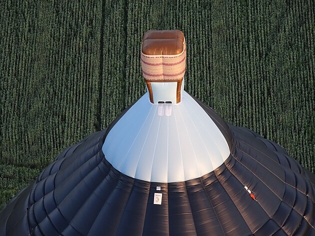 Horkovzdušný balón speciálního tvaru při záletu na konci června 2025 na Vysočině. Falešný koš na špici balónu.