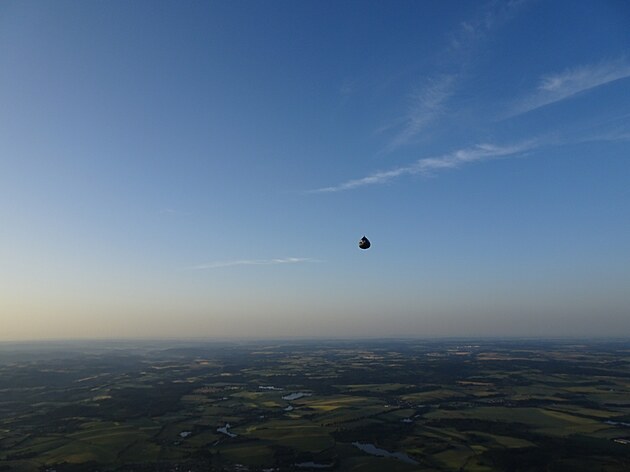 Horkovzdušný balón speciálního tvaru při záletu na konci června 2025 na Vysočině.
