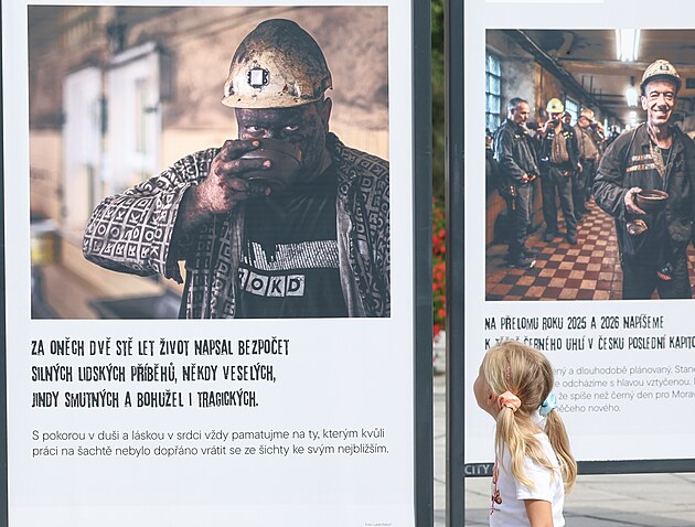 Putovní venkovní výstava hornických fotografií s názvem Odcházíme… s hlavou vztyčenou! vzdává hold lidem, kteří spojili svou profesi s náročnou prací na šachtách. Putovní výstava na Univerzitním náměstí v Karviné. (11. září 2025)