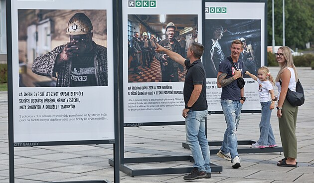 Putovní venkovní výstava hornických fotografií s názvem Odcházíme… s hlavou vztyčenou! vzdává hold lidem, kteří spojili svou profesi s náročnou prací na šachtách. Putovní výstava na Univerzitním náměstí v Karviné. (11. září 2025)