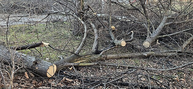 Plošné kácení zdravých stromů v areálu budoucího krizového dětského centra Pluto v Havířově. (19. března 2025)