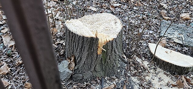 Po zdravých stromech stojících i zcela mimo budoucí zástavbu dětského krizového centra Pluto zůstaly jen pařezy. (19. března 2025)
