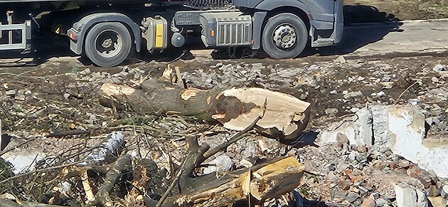 Po zdravých stromech stojících i zcela mimo budoucí zástavbu dětského krizového centra Pluto zůstaly jen rozřezané kmeny, které stavební firma převážela pryč. (19. března 2025)