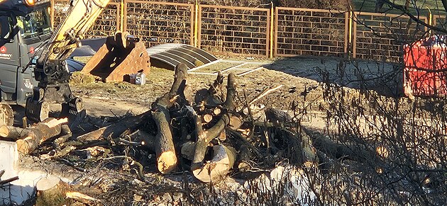 Po zdravých stromech stojících i zcela mimo budoucí zástavbu dětského krizového centra Pluto zůstaly jen rozřezané kmeny, které stavební firma převážela pryč. (19. března 2025)