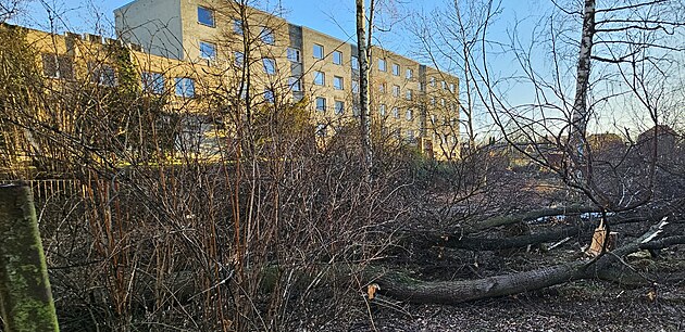 Následky plošného kácení v areálu budoucího krizového dětského centra Pluto v Havířově. (19. března 2025)