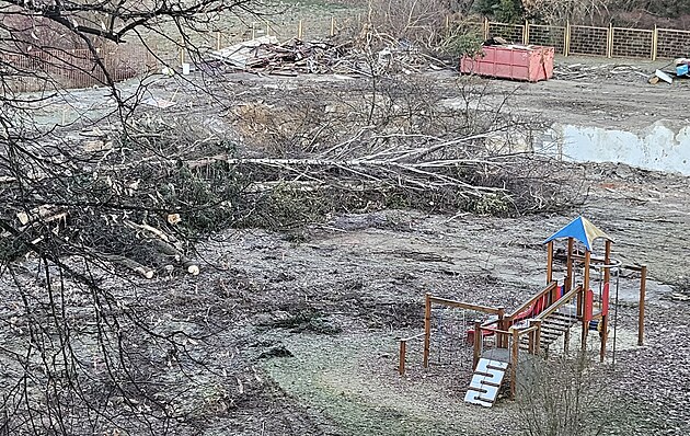 Poslední pohled na nedávno instalovaný herní prvek v areálu přestavby dětského krizového centra Pluto v Havířově. I ten byl následně zničen a odstraněn. (19. března 2025)