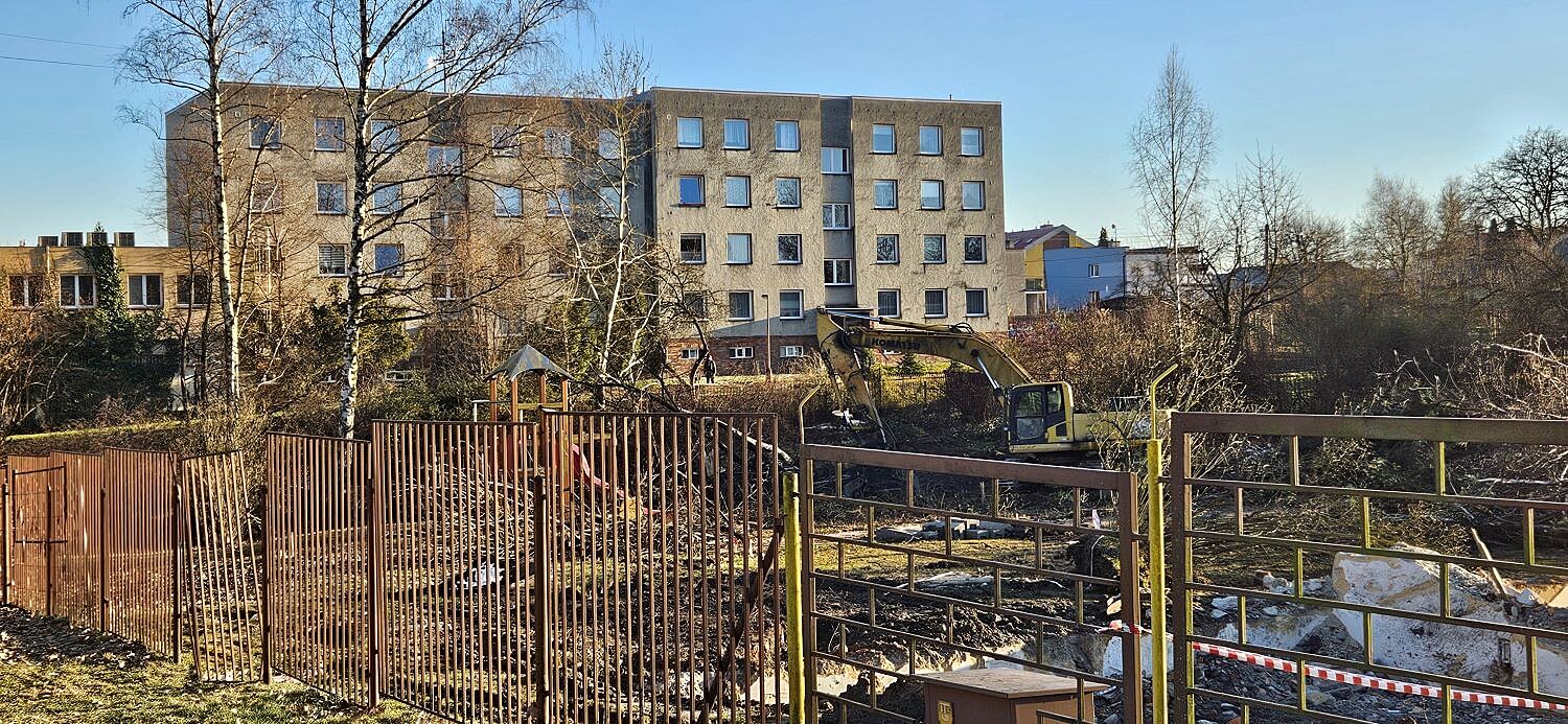 Mezi budoucím dětským centrem a okolními domy zmizela protihluková hradba zdravých stromů. (19. března 2025)