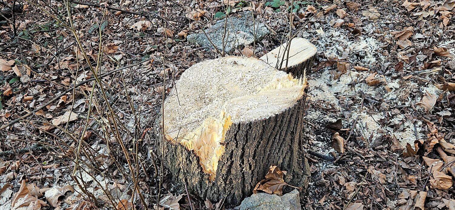Po zdravých stromech stojících i zcela mimo budoucí zástavbu dětského krizového centra Pluto zůstaly jen pařezy. (19. března 2025)