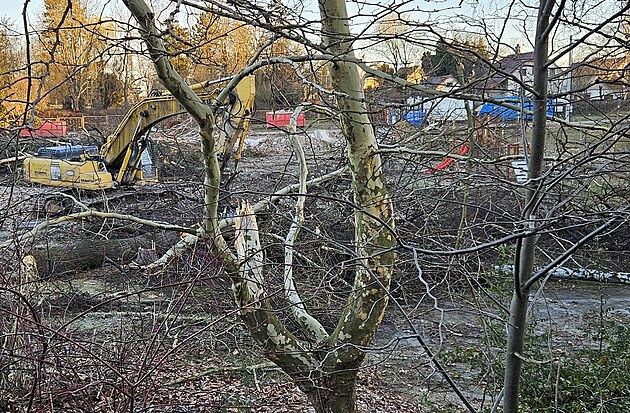 Těžkými stroji polámaný platan v areálu budoucího dětského krizového centra Pluto v Havířově.. (19. března 2025)
