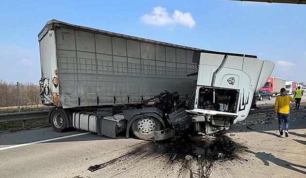 Nehoda kamionu na silnici D48 v Chlebovicích, místní části Frýdku-Místku, ve směru od polských hranic na Olomouc. (26. března 2025)